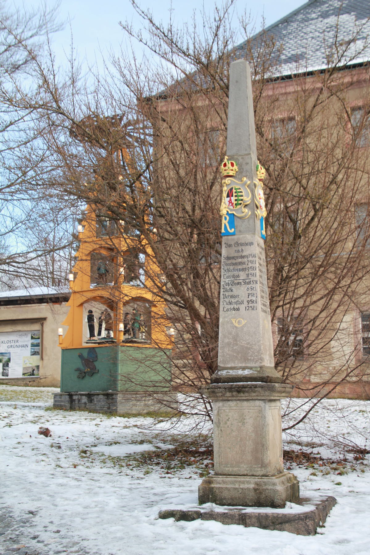 Die Distanzsäule von Grünhain im Erzgebirgskreis ist nacherfolgreicher Restaurierung wieder aufgestellt worden. Der Steinmetzbetrieb Wagler aus Mildenau hat eine sehr „sanfte“ Aufarbeitung der Postmeilensäulevorgenommen. Es wurde das Wappenstück neu strukturiert und farblich erneuert, der Schrif tblock gereinigt und die Inschriften wieder hergestellt und farblich ausgelegt. Auch das Posthorn ist nun wieder deutlich auf allen vier Seiten ersichtlich. Sonst blieb die Säule im Zustand ihres „ansehnlichen Alters“, was dem Denkmal gut zu Gesicht steht. Damit würdigt der Ort im Besonderen das Jubiläum 300 Jahre kursächsische Postmeilensäulen.