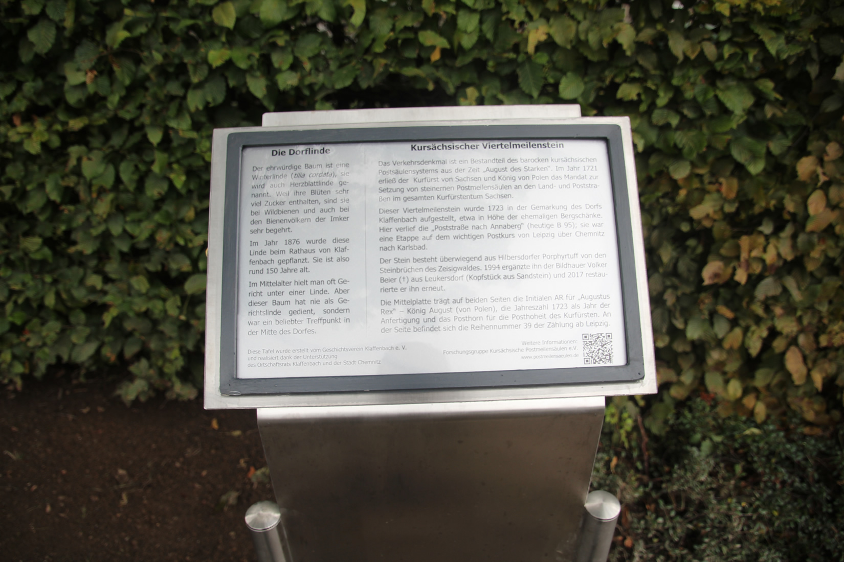 Eine Erläuterungstafel ist ebenfalls eingerichtet und es werden über QR-Codes einerseits weitere Informationen über die Chemnitzer Postmeilensäulen angeboten und andererseits die Möglichkeit zur Unterstützung des Projektes aufgerufen. Auch auf diesem Wege wollen wir für die Wiederaufstellung einer kursächsischen Distanzsäule für Chemnitz werben und dazu aufrufen, wer dieses Projekt mit unterstützen möchte, kann hier weitere Informationen anfordern.