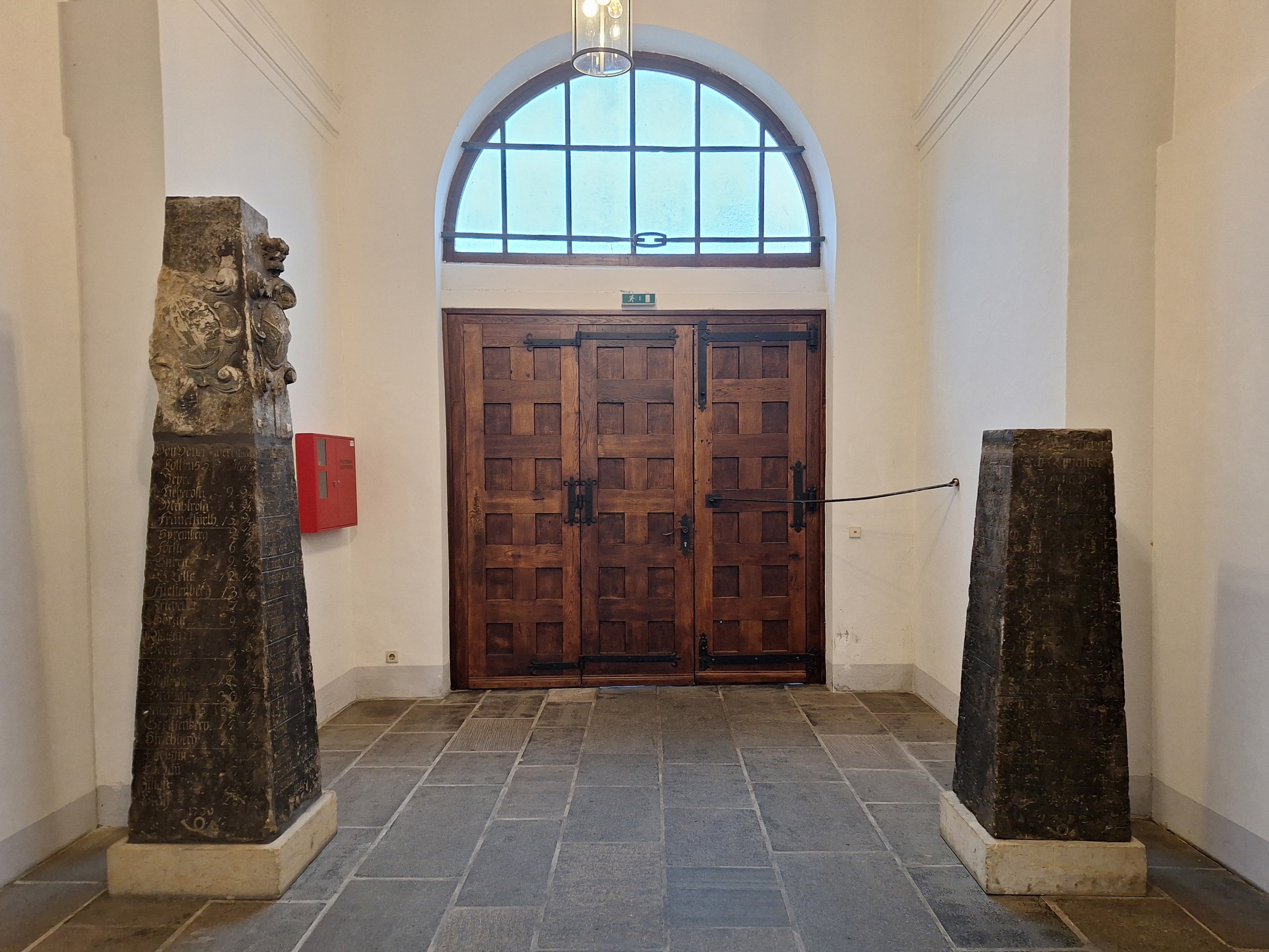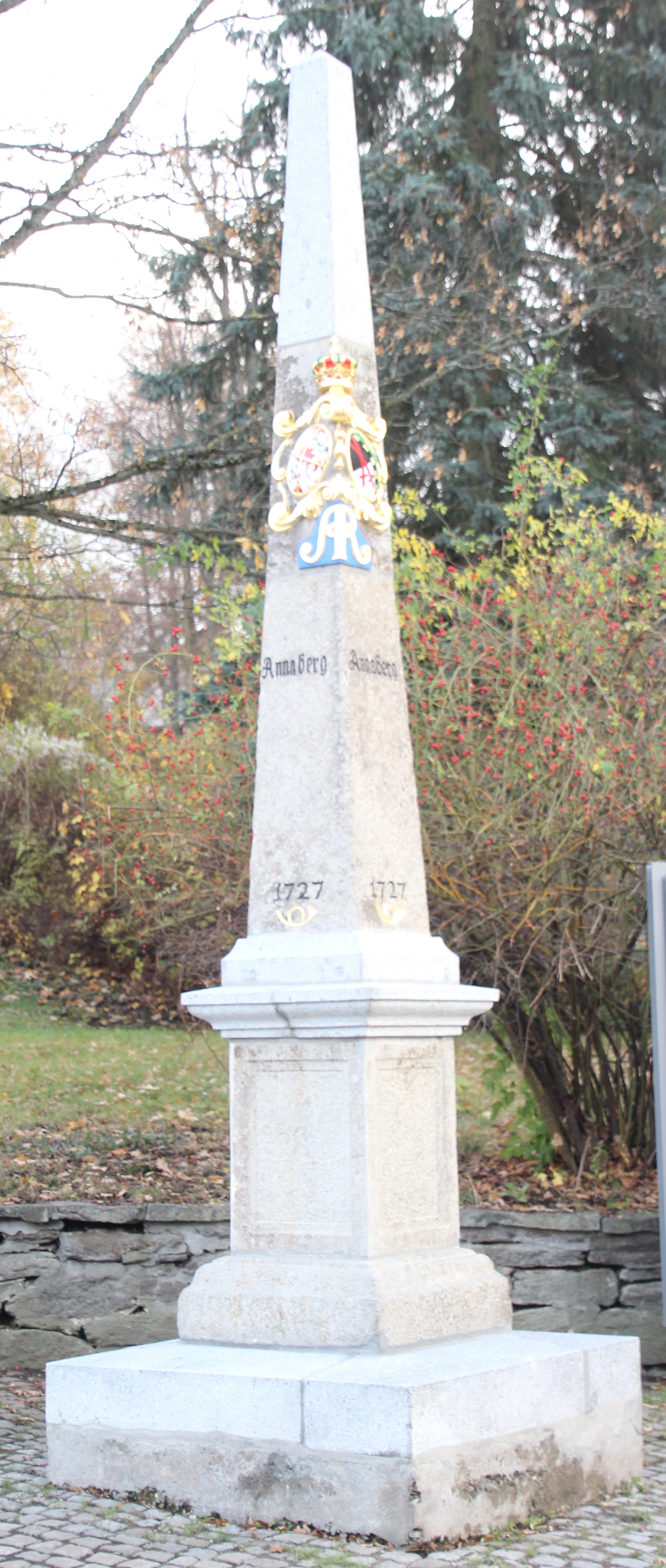 Nach kurzfristiger Freigabe von Mitteln der Stadt Annaberg-Buchholz konnte durch Steinmetz Thomas Wagler aus Mildenau die Distanzsäule vom Wolkensteiner Tor in Annaberg restauriert werden. Die Maßnahme ist vor Ort ohne Abbau der Säule im Oktober 2025 durchgeführt worden. Die Farbgebung des Wappenstückes wurde erneuert und die Inschriften sind ebenfalls aufgefrischt worden. Hier sehen wir die Säule insgesamt, das neue Wappenpaar (welches an den Annaberger Distanzsäulen jeweils nur einmal vorhanden ist) und den erneuerten Inschriftenteil.