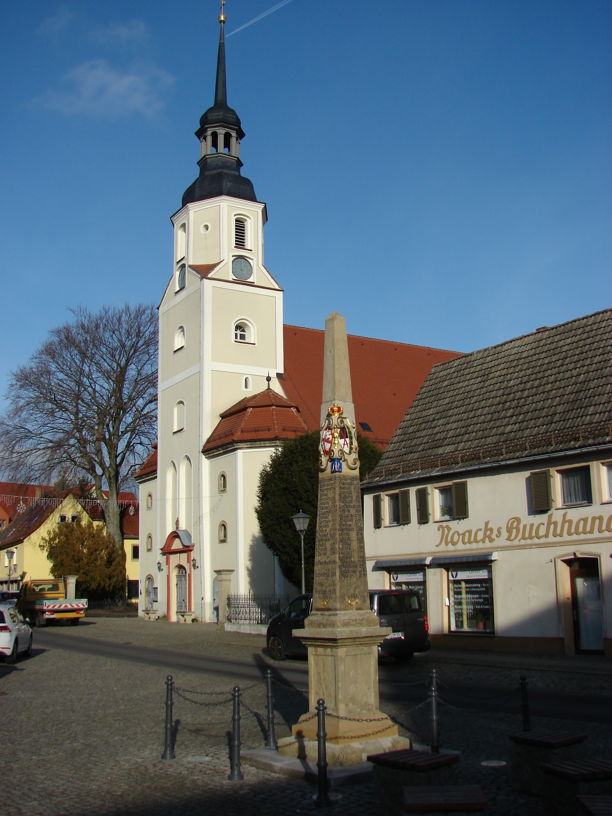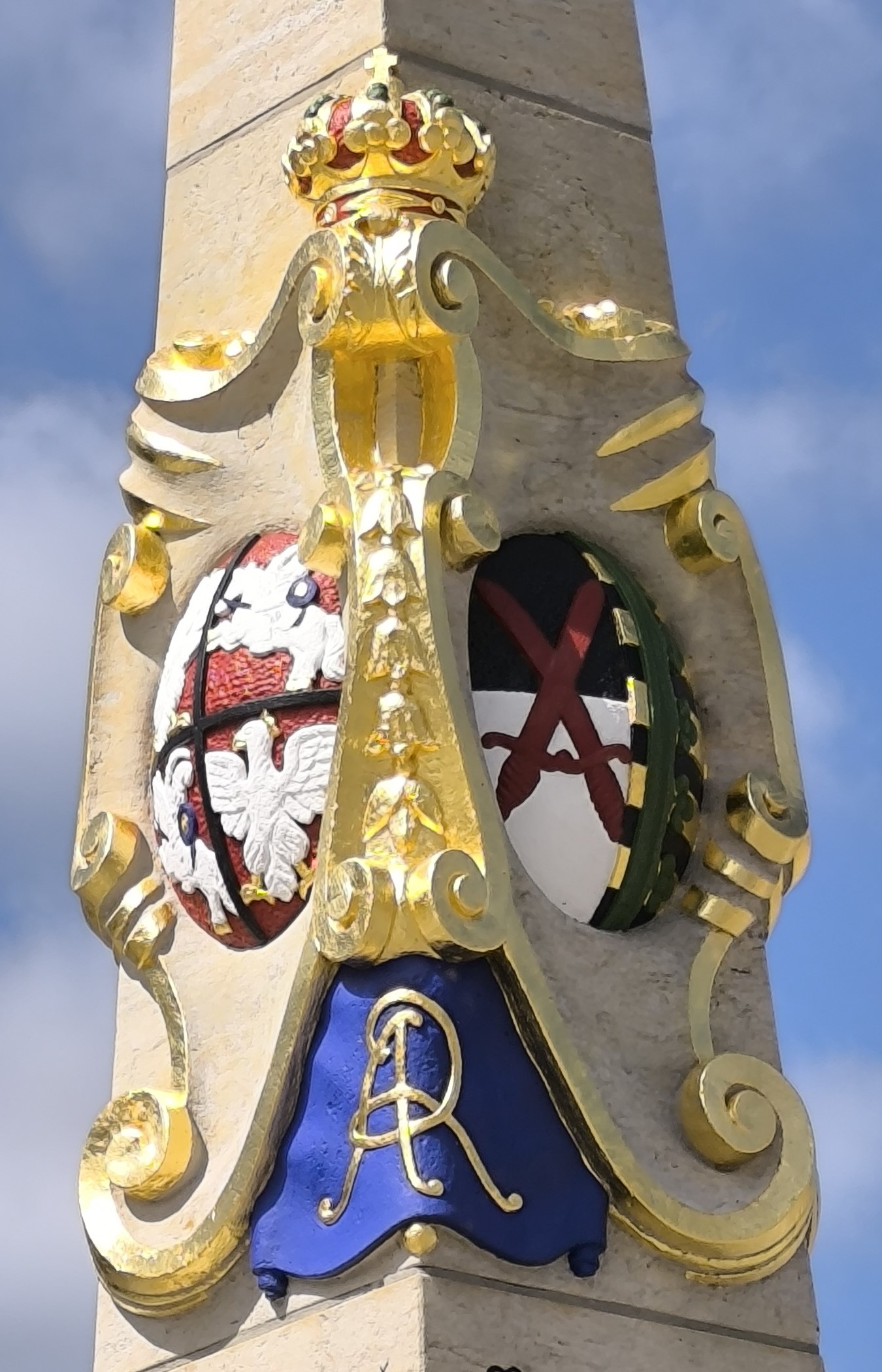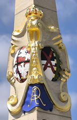Die Restaurierung der Distanzsäule von Elsterswerda ist abgeschlossen. Es wurden: die Säule insgesamt gereinigt, die Wappen und Inschriften farbig neu ausgelegt, die Vergoldungen überarbeitet, der Sockel erneuert und verschiedene Schadstellen am Postament ausgebessert. Die Arbeiten hat die ortsansässige Firma Anlauff Naturstein GmbH ausgeführt. (Fotos: Olaf Grell, Ladeburg) |