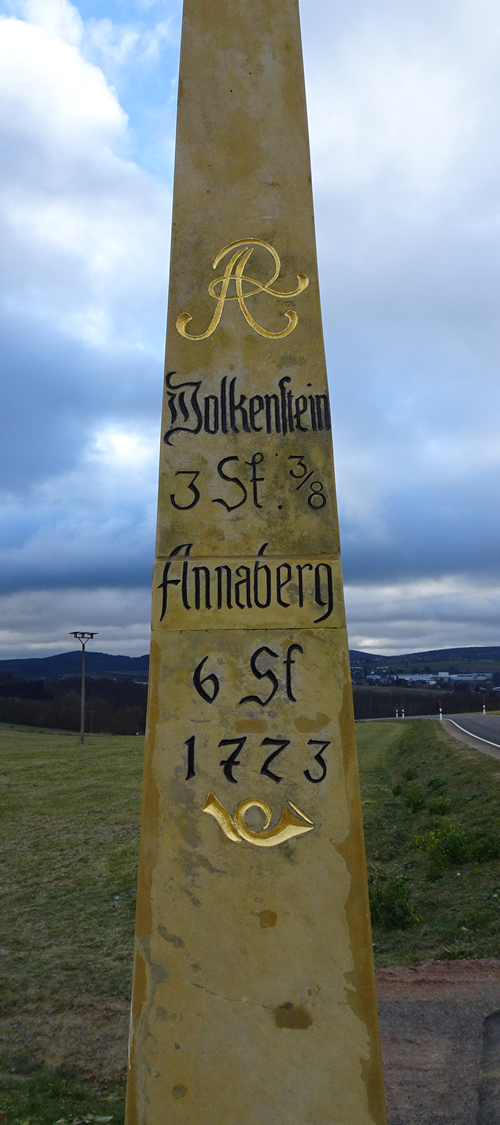 Auf dem Mittelstück der Säule sind in jeder der beiden Fahrtrichtung die Initialen AR, der Name der nächsten Stadt sowie deren Entfernung, das Anfertigungsjahr der Säule und das Posthorn angebracht. Hatte die nächste Stadt keine Poststation, so wurde zusätzlich die Entfernung zur folgenden Poststation angegeben. Die Reihennummer befindet sich auf der zur Straße gewandten Seite und ist, wie bei den Halbmeilensäulen, immer eine gerade Zahl.