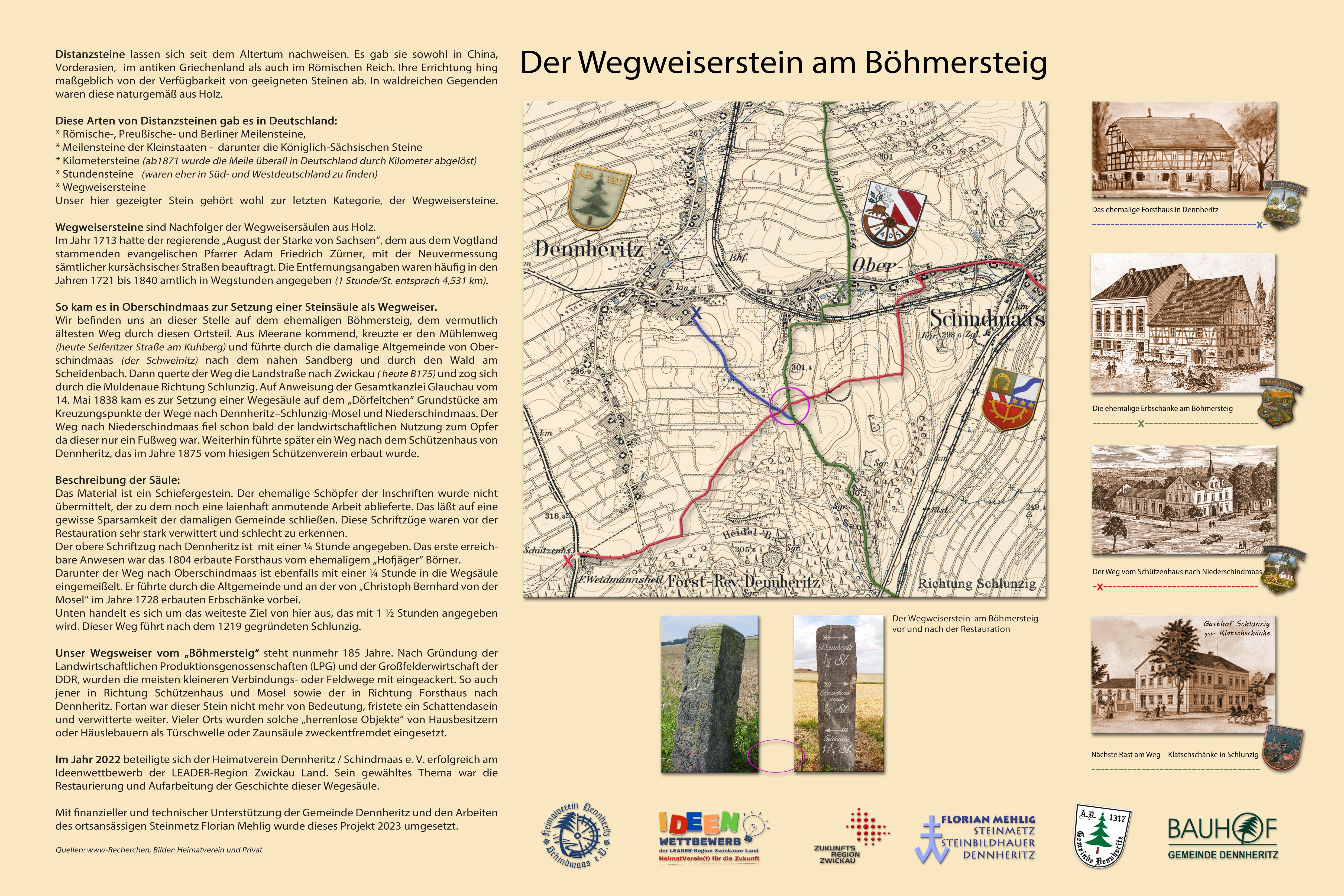 In Dennheritz (LK Zwickau) wurde die durch Steinmetz Mehlig aus Dennheritz restaurierte Wegweisersäule von 1838 an der Kreuzung der Wege Dennheritz-Schlunzig-Mosel und Niederschindmaas zusammen mit einer Infotafel wieder aufgestellt.