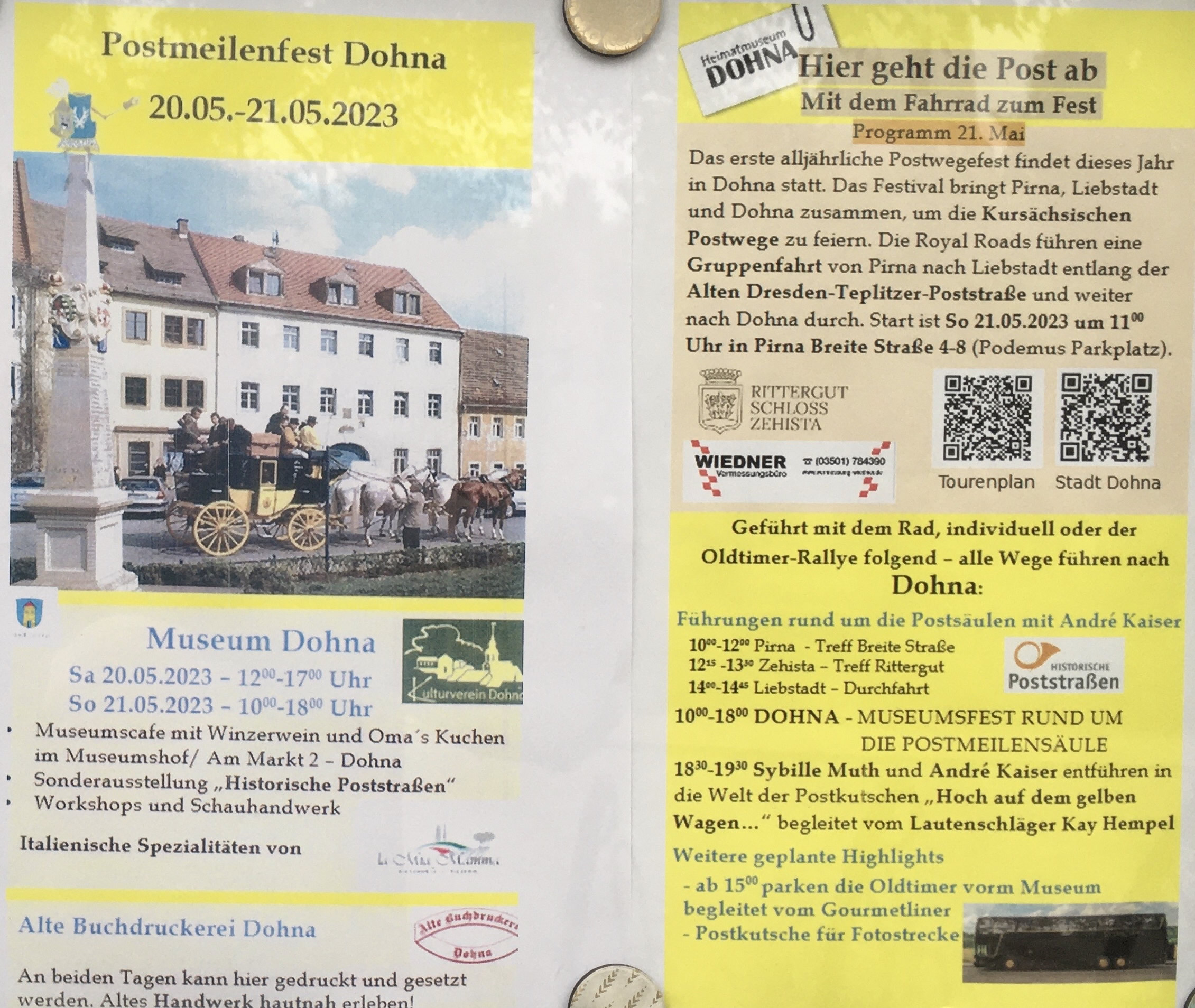 Am 20. und 21. 5. wurde in Dohna das Postmeilenfest gefeiert. André Kaiser bot in Pirna, Zehlsta und Liebstadt Postsäulen-Führungen an und abends entführten Sybille Muth und André Kaiser in die Welt der Postkutschen "Hoch auf dem gelben Wagen..." begleitet vom Lautenschläger Kay Hempel.