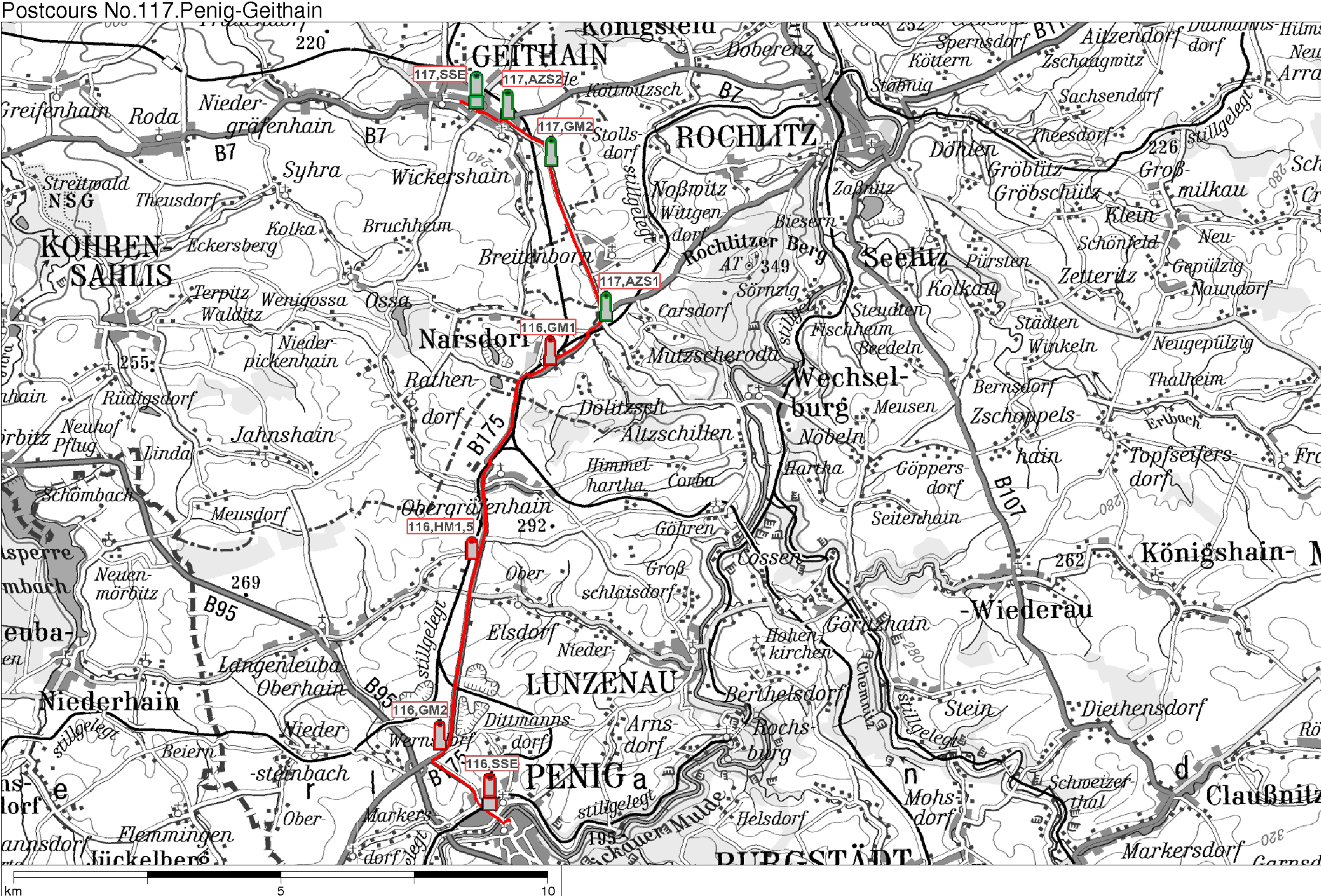 Beim Klick auf die Postkurs-Nummer öffnet sich eine Landkarte mit dem eingezeichneten Postkurs.