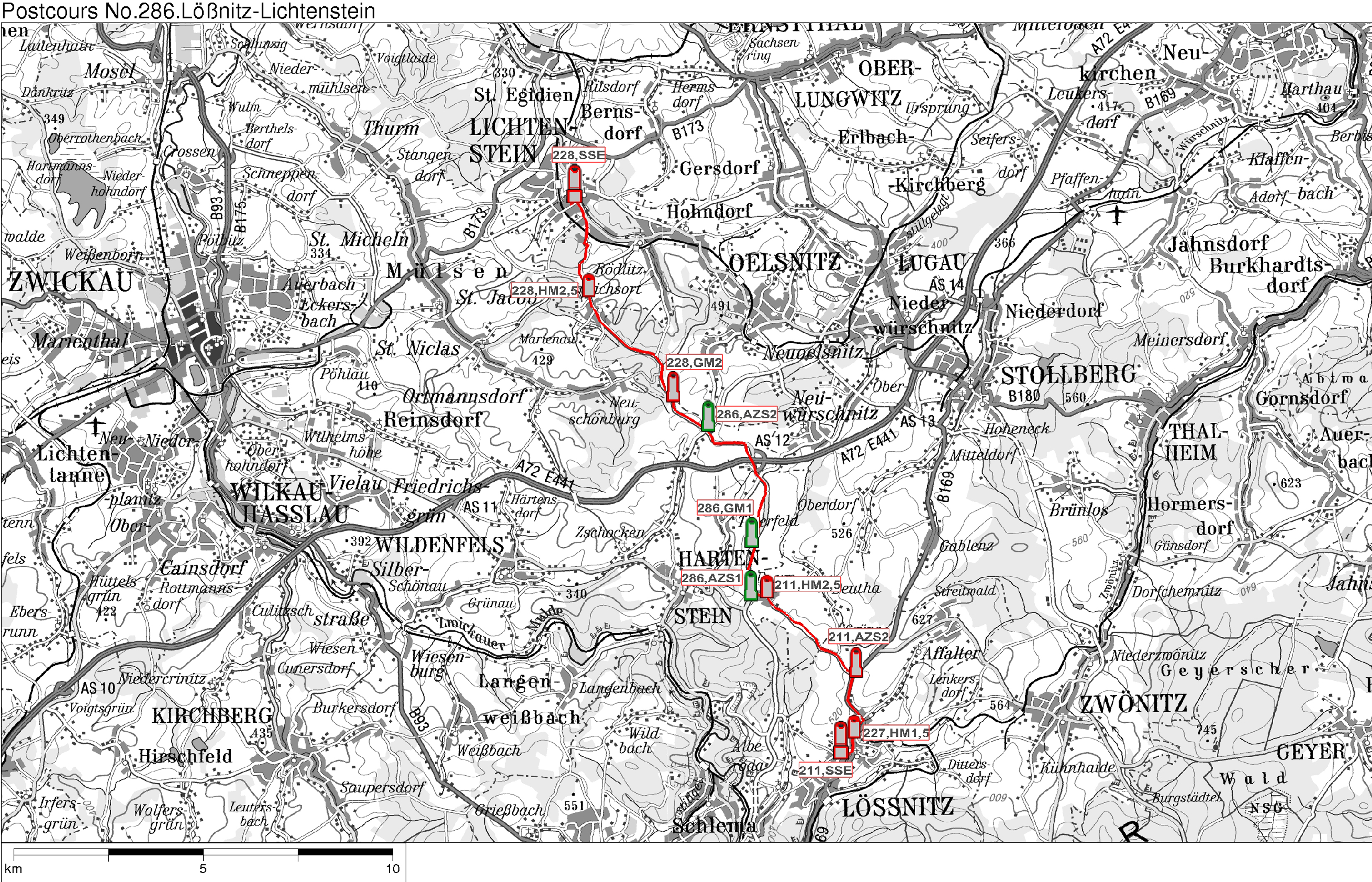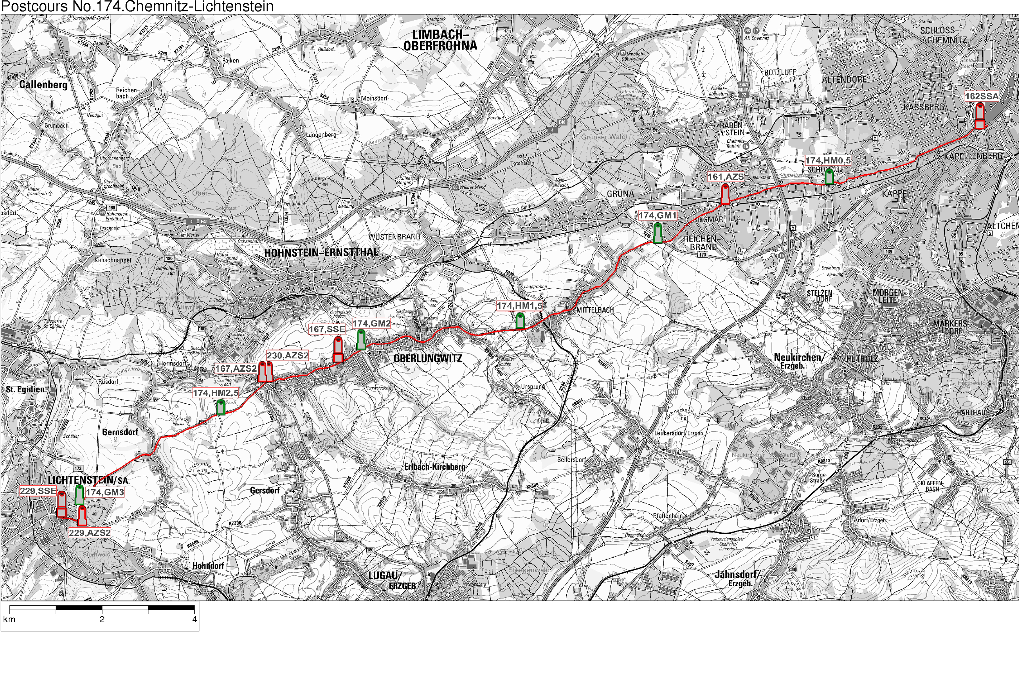 Beim Klick auf die Postkurs-Nummer öffnet sich eine Landkarte mit dem eingezeichneten Postkurs.